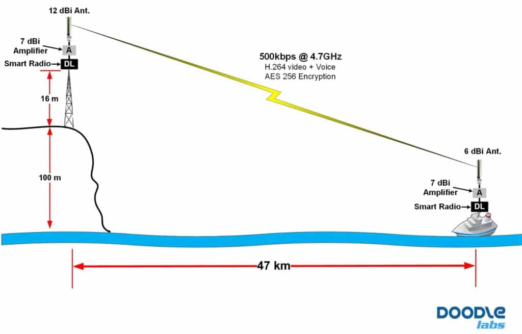 A customer (name withheld by request) chose Doodle Labs 4.7 GHz Mesh Rider Radios to design a secure, long range (47km) ship to shore extension of the Coast Guard’s terrestrial Voice over Internet Protocol (V.O.I.P), + real-time video streaming network.
