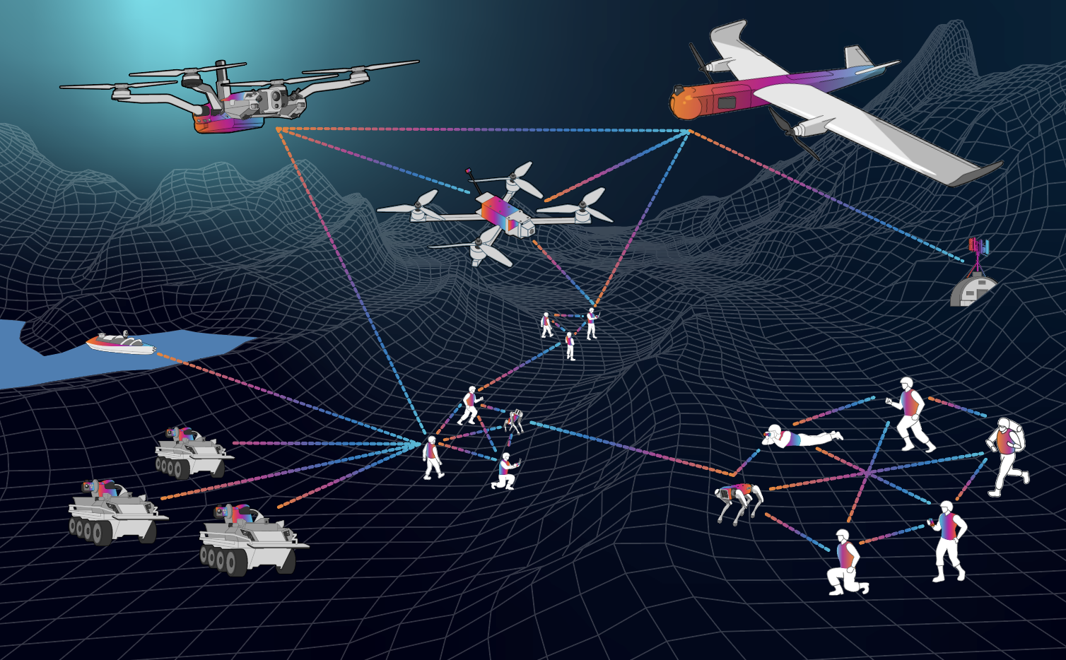 Multiple assets such as soldiers, drones, ground vehicles, sensors, and autonomous machines operate on one cohesive network with shared, real-time situational awareness.